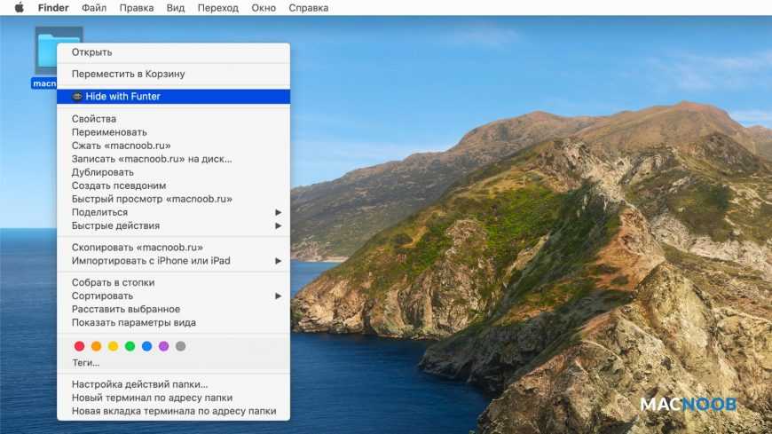 Funter интегрируется в меню macOS (это можно отключить в настройках), что позволяет устанавливать либо снимать атрибут «скрытый» для файлов и папок кликом правой кнопки мыши.