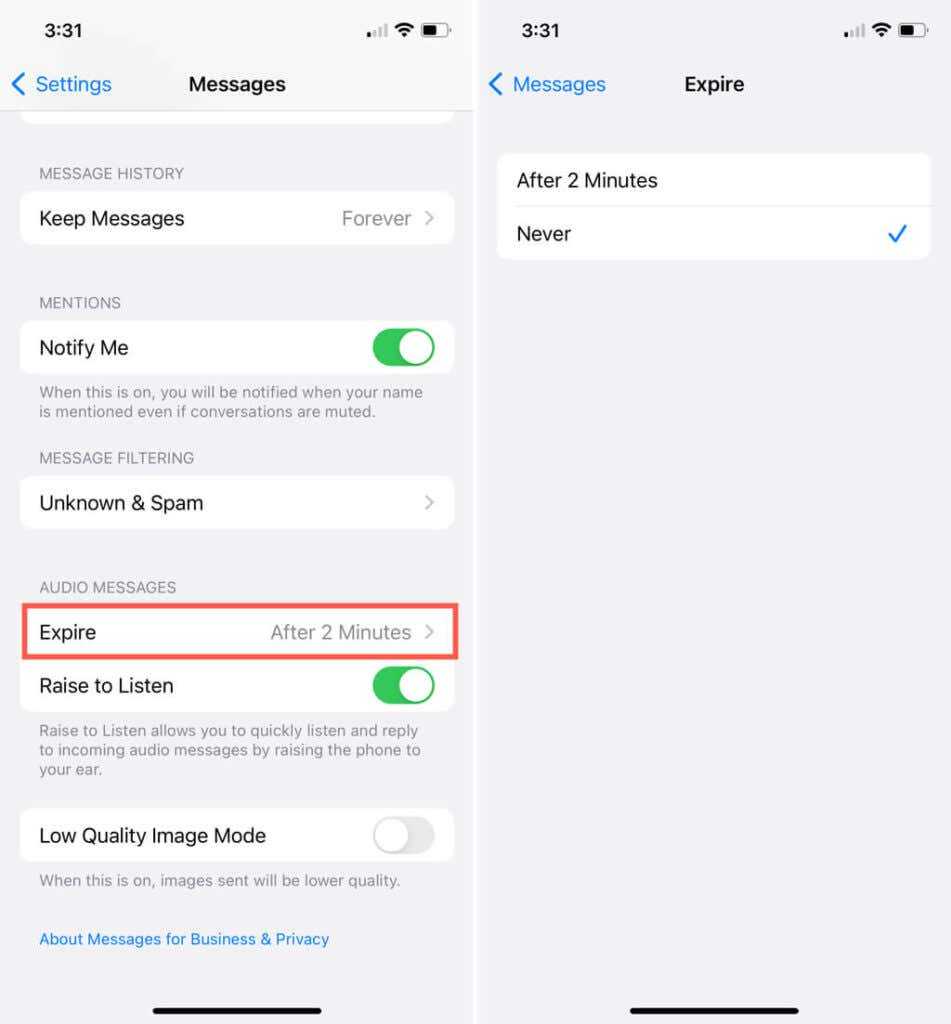 По умолчанию звуковые сообщения на iPhone и iPad истекают через две минуты после их прослушивания. Вы можете изменить это, перейдя в « Настройки(Settings) »> « Сообщения(Messages) » и изменив « Срок(Expire) действия» в разделе « Аудио сообщения(Audio Messages) » .