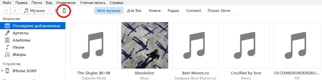 1На ПК откройте iTunes (если у вас нет этой программы, скачайте ее с официального сайта и установите). Подключите старый гаджет к компьютеру при помощи USB кабеля. Выберите iPhone в меню iTunes, то есть нажмите на его значок в левом верхнем углу окна программы.