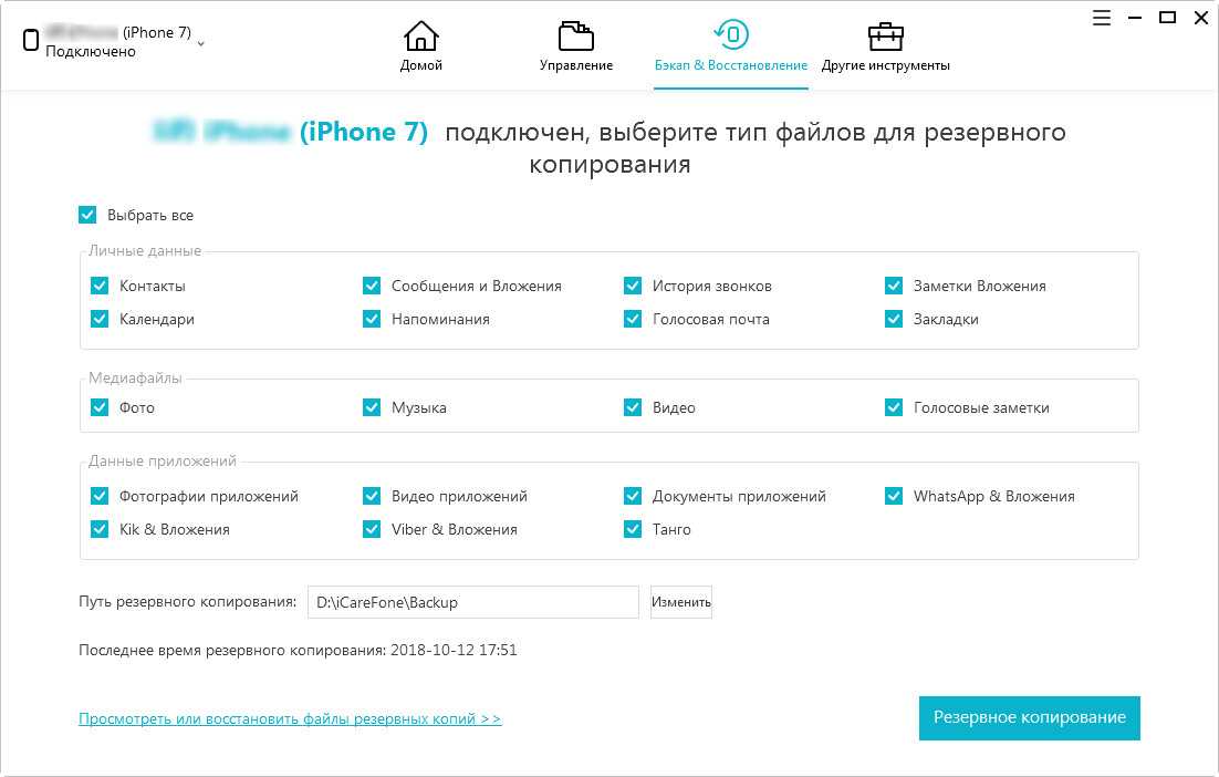 Программа Tenorshare iCareFone сочетает в себе несколько функций, одна из которых возможность делать резервное копирование и затем восстановление. И главное ее преимущество – это возможность работать с типами данных по отдельности. Можно отдельно сохранить сообщения со старого айфона, а затем перенести их на новый. Вот, как это работает: