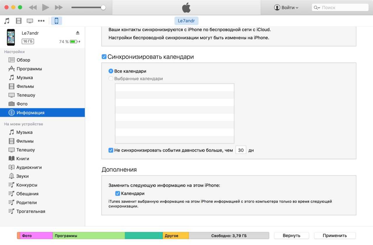 Если в настройках вашего iPhone в iTunes в меню «Информация» включить синхронизацию контактов и календарей и в разделе «Дополнения» установить галочку напротив соответствующей категории данных (контакты, календари), то во время следующей синхронизации iTunes заменит выбранную информацию на вашем айфоне информацией с этого компьютера. Вернуть контакты и календари можно из резервной копии. Лично я для синхронизации контактов и заметок использую iCloud, что и вам советую.