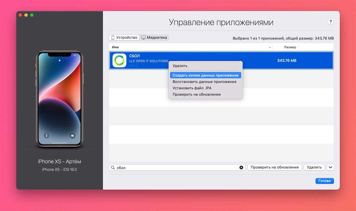 Через контекстное меню выберите пункт Создать копию данных приложения и укажите место сохранения копии на компьютере.