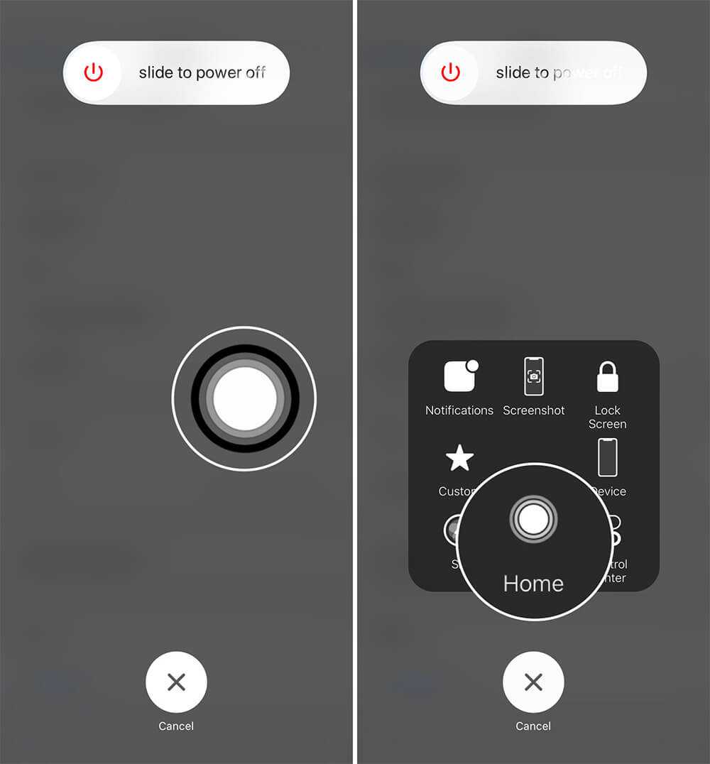 Один раз нажмите кнопку AssistiveTouch . Наконец, нажмите и удерживайте виртуальную кнопку Домой в AssistiveTouch. Оставьте его, когда экран iPhone начнет мигать и вернется к экрану блокировки.
