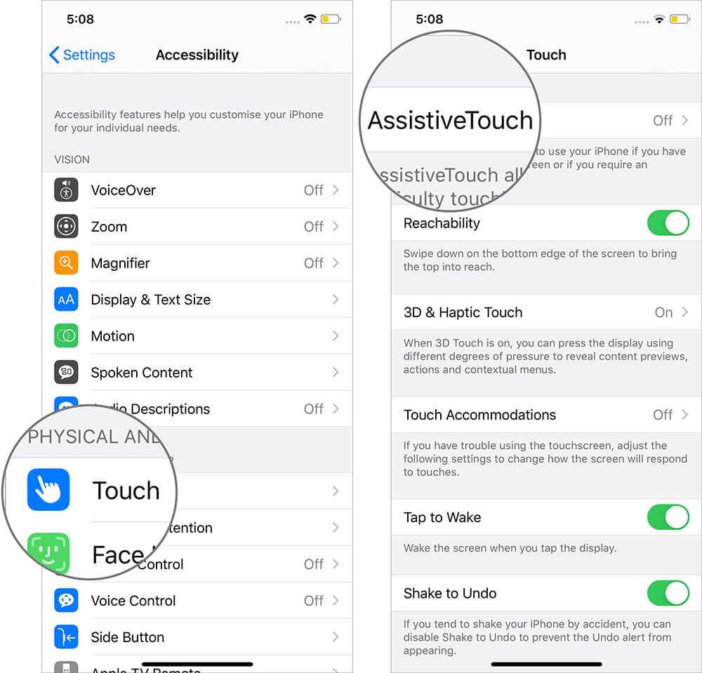 Теперь нажмите Сенсорный экран → AssistiveTouch..