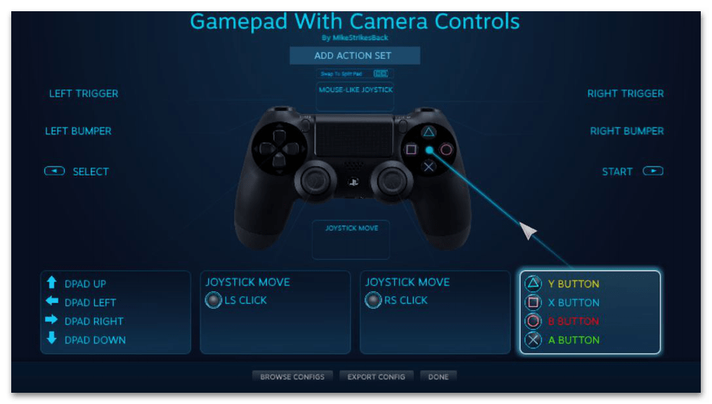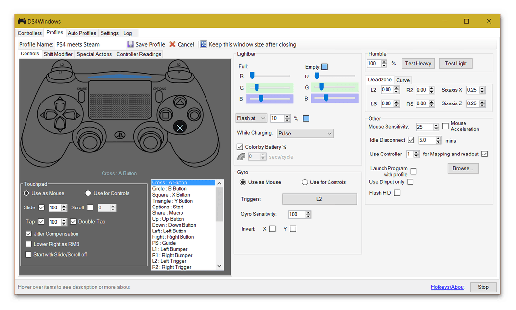 - Затем подключите ваш Dualshock 4 любым способом (через кабель или через Bluetooth). Как только вы это проделаете, Стим автоматически откроет окно персонализации, в котором вы можете настроить, например, действия и чувствительность гироскопа, а также переназначить клавиши геймпада.