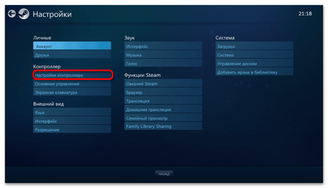 - Выбираем режим отображения Big Picture «Настройки» «Настройки контроллера».