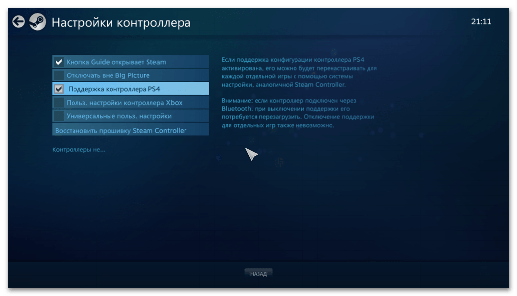 - Активируйте поддержку Dualshock 4 в Steam: