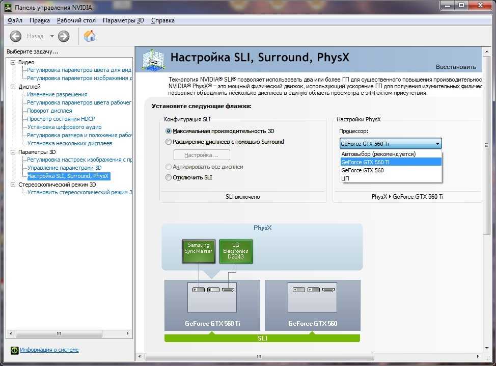 - В подменю «Настройки 3D» следует выбрать пункт «Настроить SLI, PhysX».