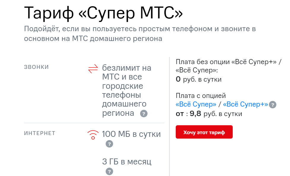 И последний вариант — с пакетом Все Супер+. Он тоже дает безлимит на МТС и звонки на домашние телефоны своего региона, но есть отличие в интернете: дается 3 ГБ на месяц (зачисляются единоразово). Стоит такой вариант 9.80 р/сутки.