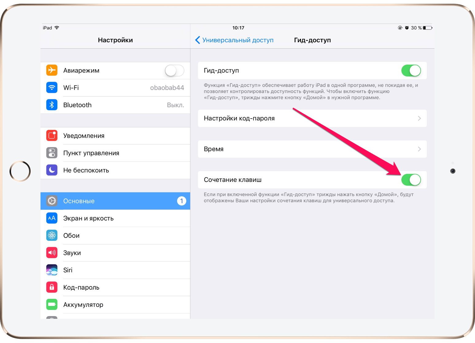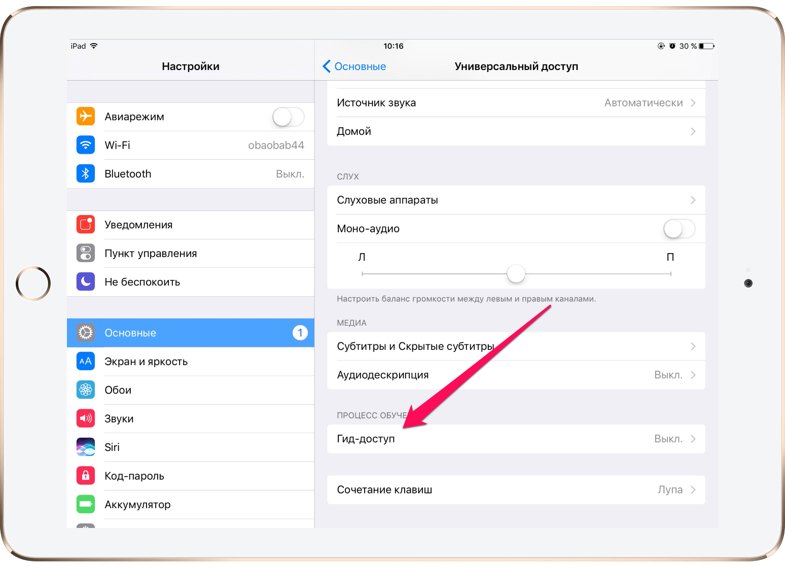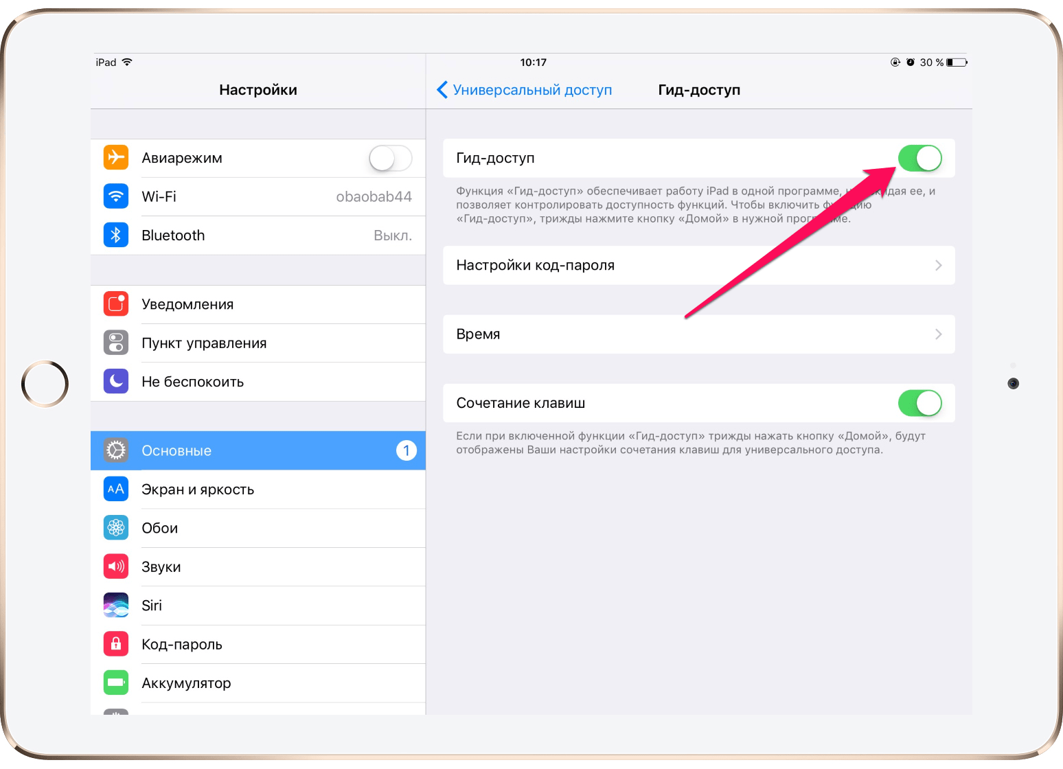 Чтобы гид-доступ начал работать, необходимо зайти в раздел «Настройки», перейти во вкладку «Основные», а оттуда — в раздел «Универсальный доступ». В секции «Процесс обучения» активируется вкладка «Гид-доступ».