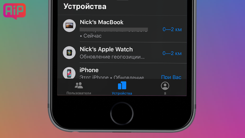 На вкладке «Устройства» можно посмотреть список всех устройств, которые используются членами семьи человека. iPhone, с которого осуществляется отслеживание, отмечается пометкой «При вас».