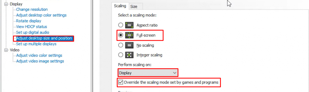 Navigate to “Adjust desktop size and position” tab, and make sure that under Scaling Mode you select Full-screen, and that the scaling is performed on Display.