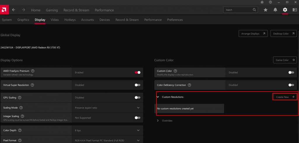 Next, navigate to Gaming -> Display, and on the right side, you should see the “Custom Resolution” option. Click on “Create New“.