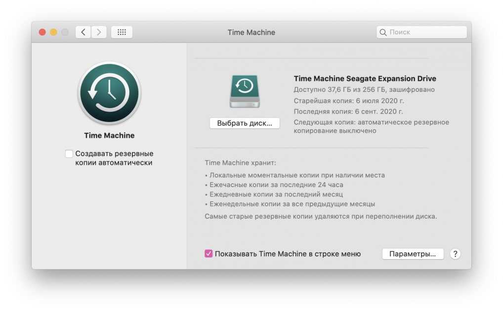 Если у вас есть внешний накопитель, то идеальным решением станет создание резервной копии системы. Сделать это можно через штатную утилиту Time Machine. Подключаете внешний диск, форматируете его в формат HFS и указываете его в качестве резервного в Time Machine. Дело за малым – выбрать папки для копирования (те же фильмы или музыку можно посмотреть или послушать онлайн) и дождаться окончания процедуры.