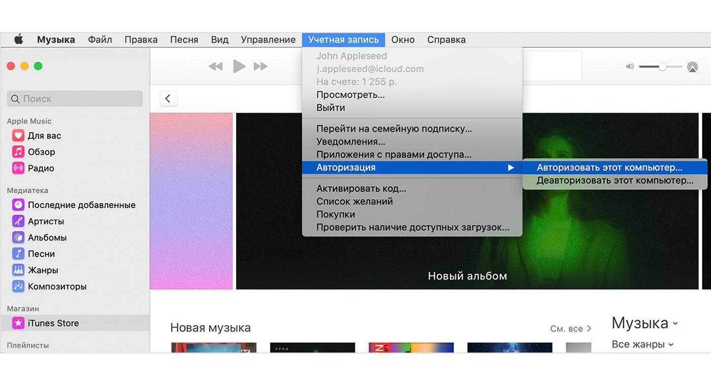 - Деавторизируйте Mac в iTunes, чтобы новый владелец вашего компьютера не получил доступ к вашей медиатеке iTunes. Откройте iTunes, на вкладке Учетная запись выберите Авторизация — Деавторизовать этот компьютер, затем нажмите Выйти. Это необходимо, чтобы на новом компьютере при входе в свою медиатеку iTunes не появилось сообщение о том, что вы исчерпали лимит в пять компьютеров. .
