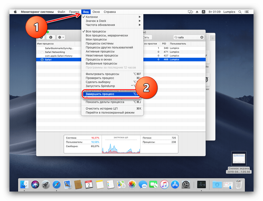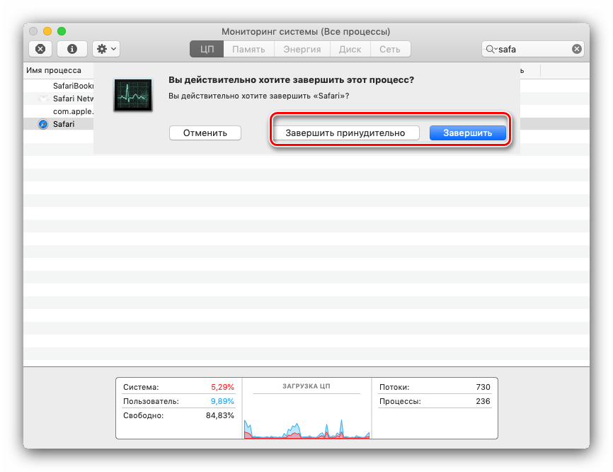 В macOS присутствует инструмент, подобный «Диспетчеру задач» в Windows – «Мониторинг системы». В этой утилите, как и в её аналоге на Виндовс, есть опция завершения процессов, что поможет закрыть зависшую программу.