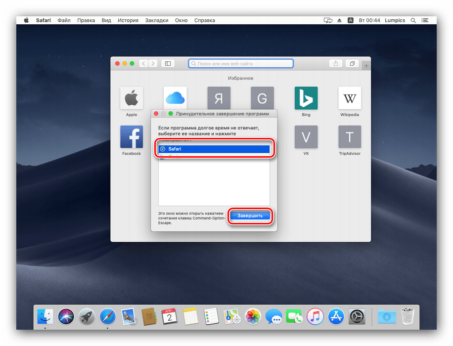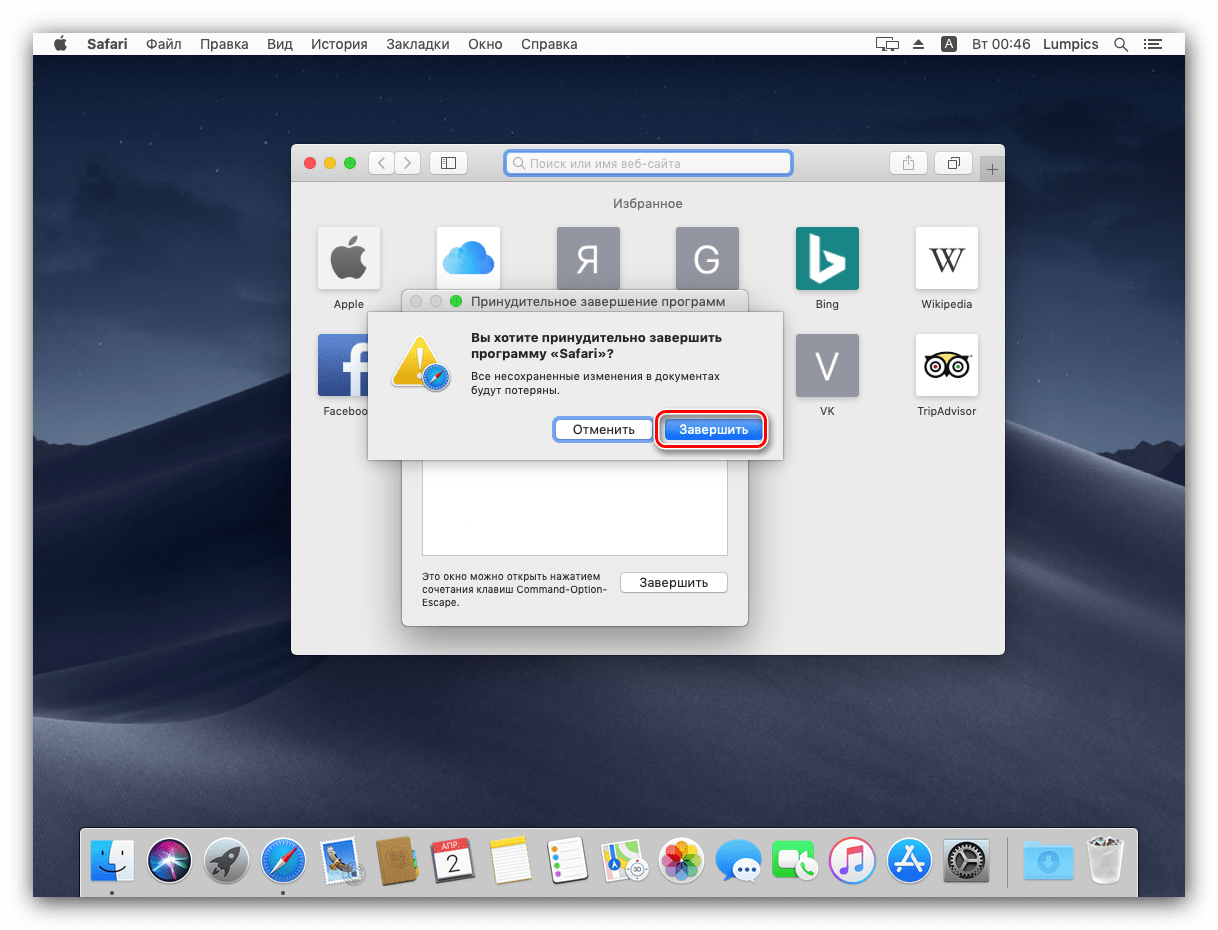 Любое приложение можно закрыть принудительно через панель Dock. Для этого зажмите клавишу Option