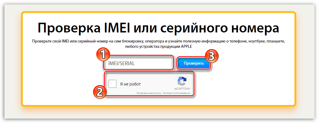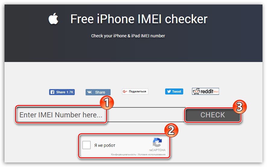 - Все очень просто: вы переходите на страницу веб-сервиса и указываете в графу уникальный номер проверяемого гаджета. Для запуска проверки потребуется поставить галочку около пункта «Я не робот», а затем кликнуть по пункту «Check».