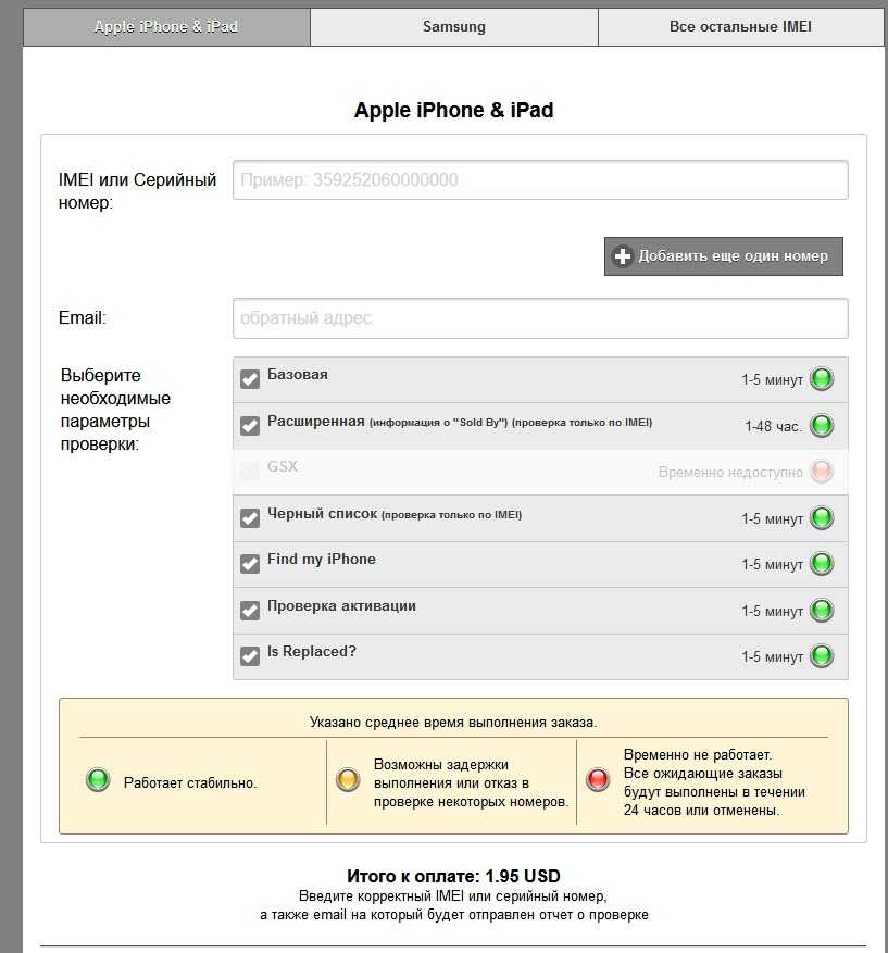 Если упомянутый в предыдущем разделе интернет-ресурс не отвечает, проверить подлинность IMEI можно и с помощью этого сайта. Будущему хозяину Айфона достаточно: