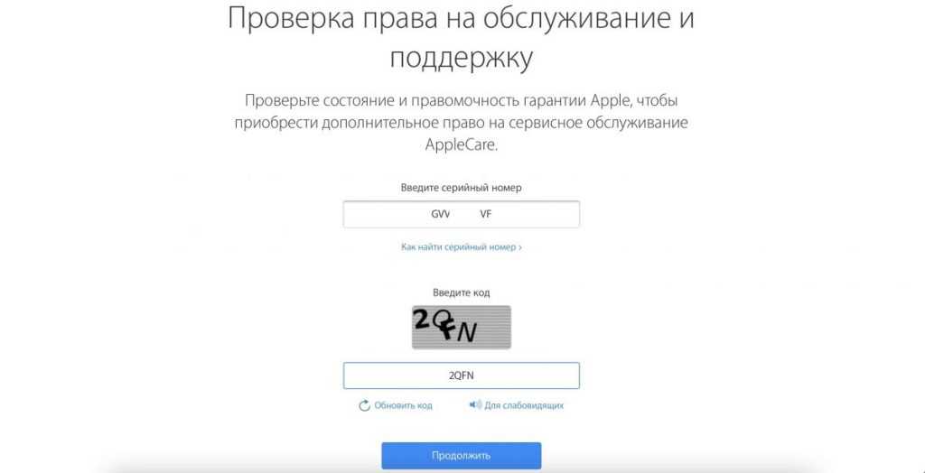 На официальном сайте Apple вставьте серийный номер в поле «Введите серийный номер», пройдите проверку кодом и нажмите продолжить.