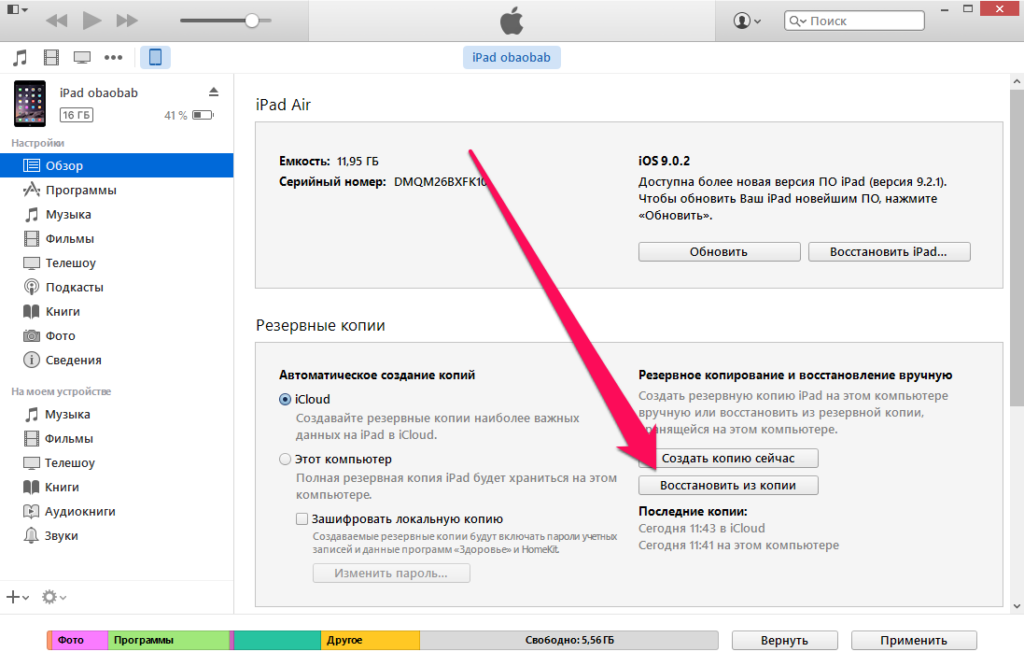 Поиск резервной копии через iTunes