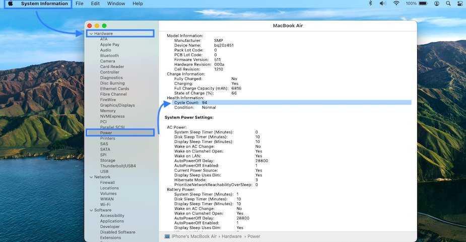 - Перейдите в «Оборудование»> «Питание», чтобы просмотреть количество циклов вашего MacBook.
