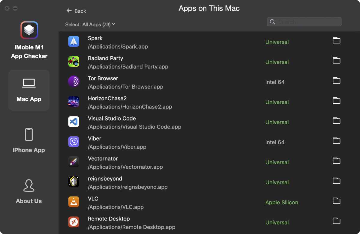 After the scan completes, iMobie M1 App Checker will provide a compatibility report. You can view this report to identify which apps are fully compatible, partially compatible, or not optimized for M1 architecture.