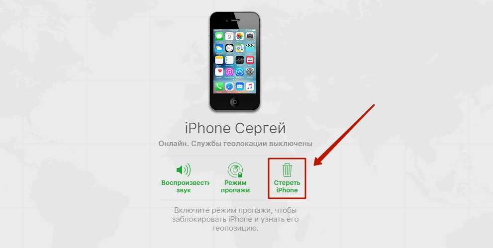 - Кликните по иконке заблокированного телефона и выберите в открывшемся меню опцию «Стереть iPhone».