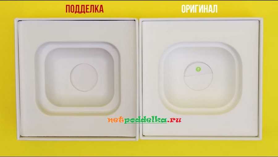 Оригинальный футляр выполнен в корпусе с закругленными боками, которые плавно переходят в обратную часть кейса. Фейковые AirPods зачастую продаются в квадратных и овальных футлярах. Также продаются подделки, передняя часть кейса которых имеет закругленную форму, а задняя – плоскую.