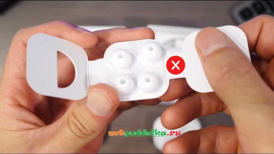 У оригинала есть картонный мини-чехольчик со сменными силиконовыми амбушюрами разных размеров. Маленькие обозначены как S, большие — как L. На самих же наушниках надеты средние, M. Все вкладыши надежно зафиксированы. У подделок дополнительных амбушюр нет, либо они легко выпадают со своих мест. Это еще один критерий как определить оригинальные AirPods Pro от подделки.