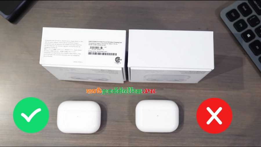На задней части футляра красуется надпись Designed by Apple in California, а на самих наушниках есть обозначения L и R (на английском языке левый и правый соответственно). На фейках нет надписей (а если есть, то плохо читаются).