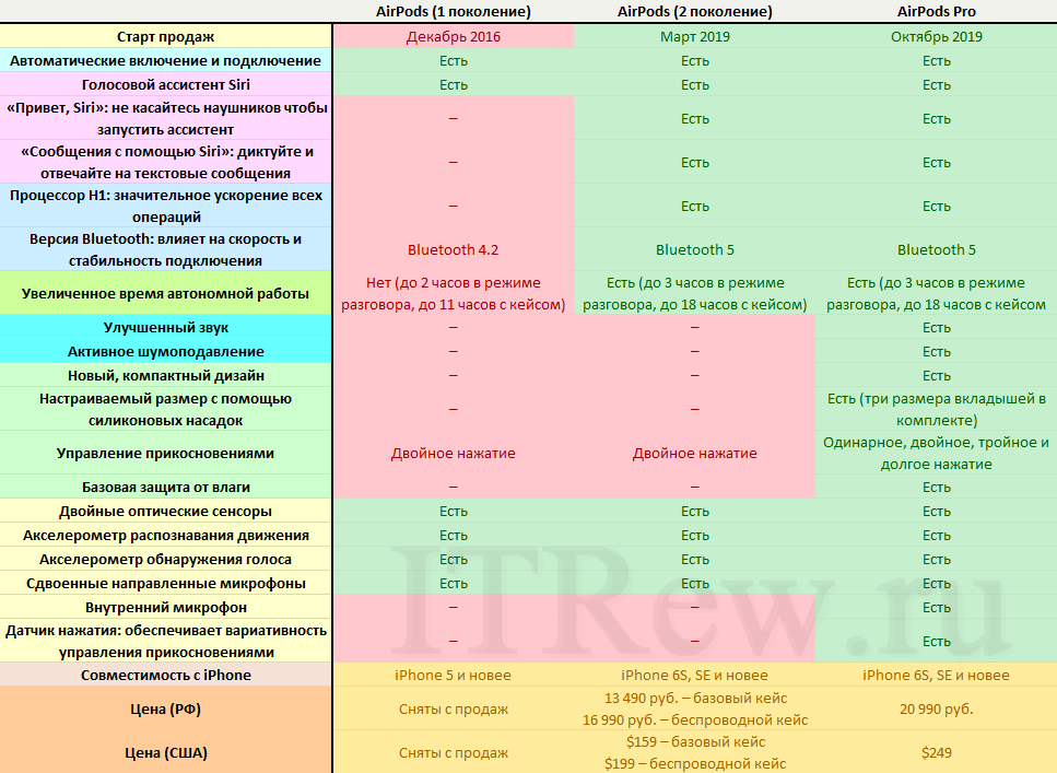 Детальное сравнение беспроводных наушников Apple. Кликните для увеличения