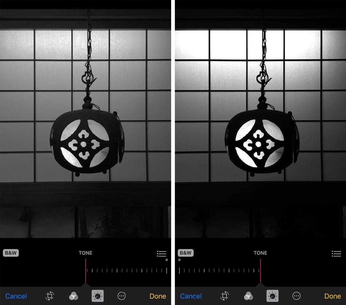 Опция «Тон» похожа на настройку «Контраст», которая влияет на яркость теней и бликов. Если вы передвинете ползунок в крайние левую и правую стороны, вы’ увидите, что эта опция делает с вашей фотографией:
