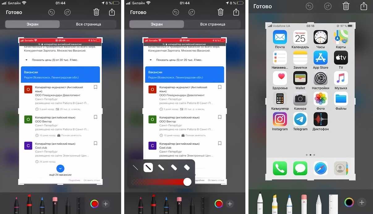 После подготовки скриншота в нижней части интерфейса появится специальная миниатюра, разрешающая в меню графического редактора, где легко наложить эффекты, добавить надписи и логотипы (Важное замечание – работает миниатюра лишь в версии операционной системы iOS 12 и старше!)