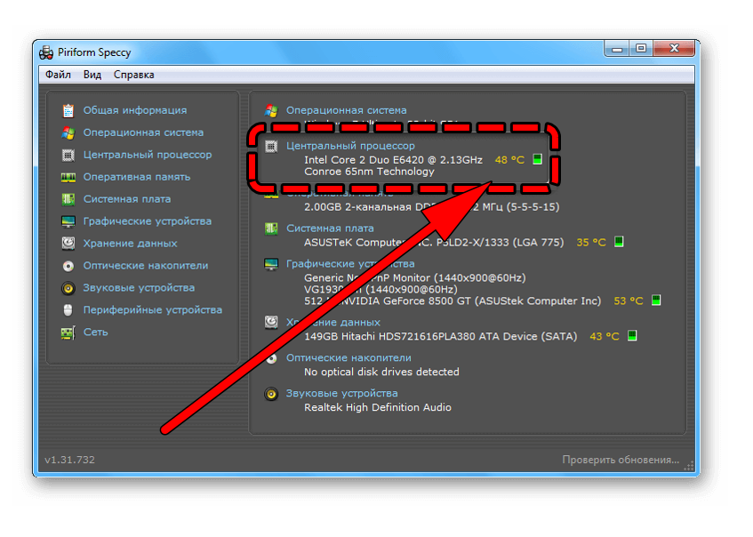 Программа бесплатная, русифицирована, отображает основные характеристики аппаратной части компьютера. Проверить температуру видеокарты можно в блоке «Графические устройства».