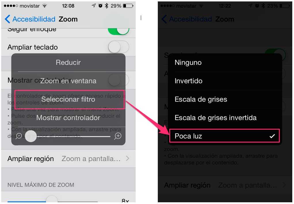 Данные настройки позволяют вам снижать минимальную яркость экрана ниже минимума путем тройного нажатия кнопки Домой.