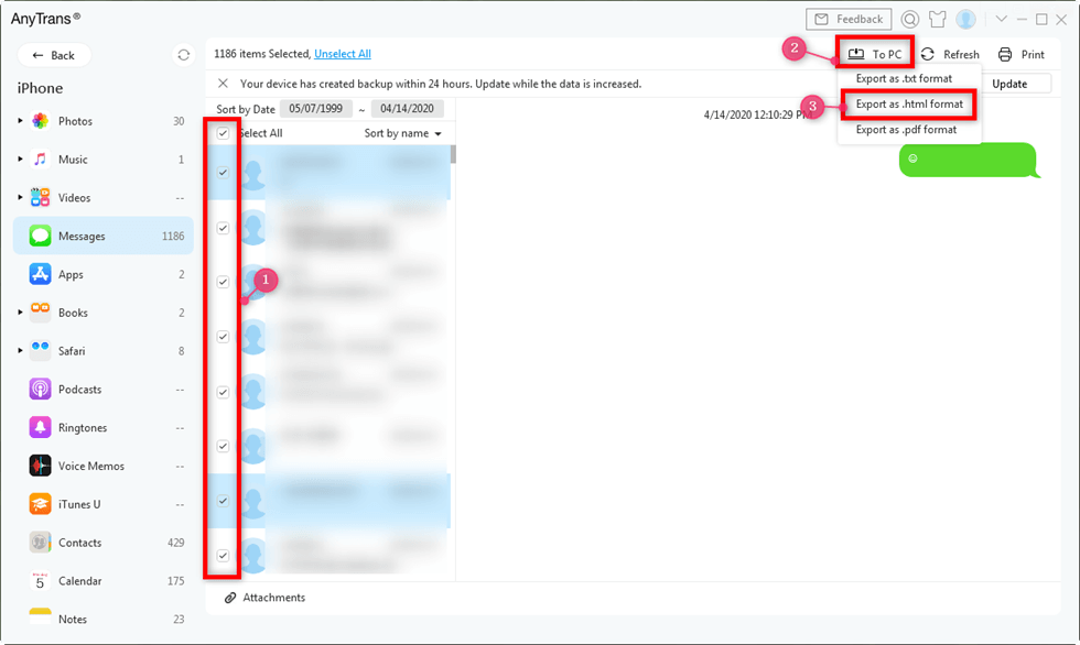 Step 4. Under To PC button, you can choose to export iPhone messages to .txt, .html or .pdf format.