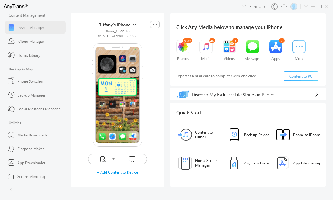 Step 1. Download AnyTrans and install it on your computer > Launch it > Connect your iPhone to computer (PC or Mac) with a USB cable. Choose the Device Manager in the main interface.
