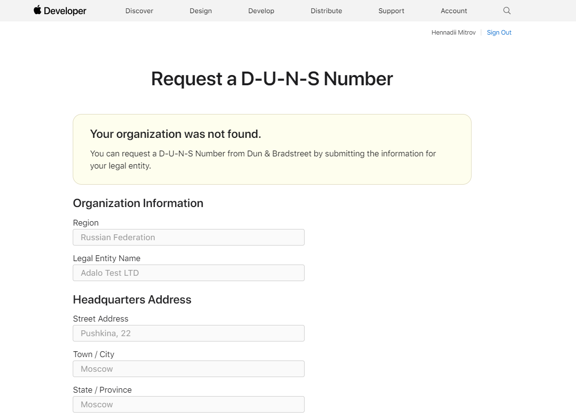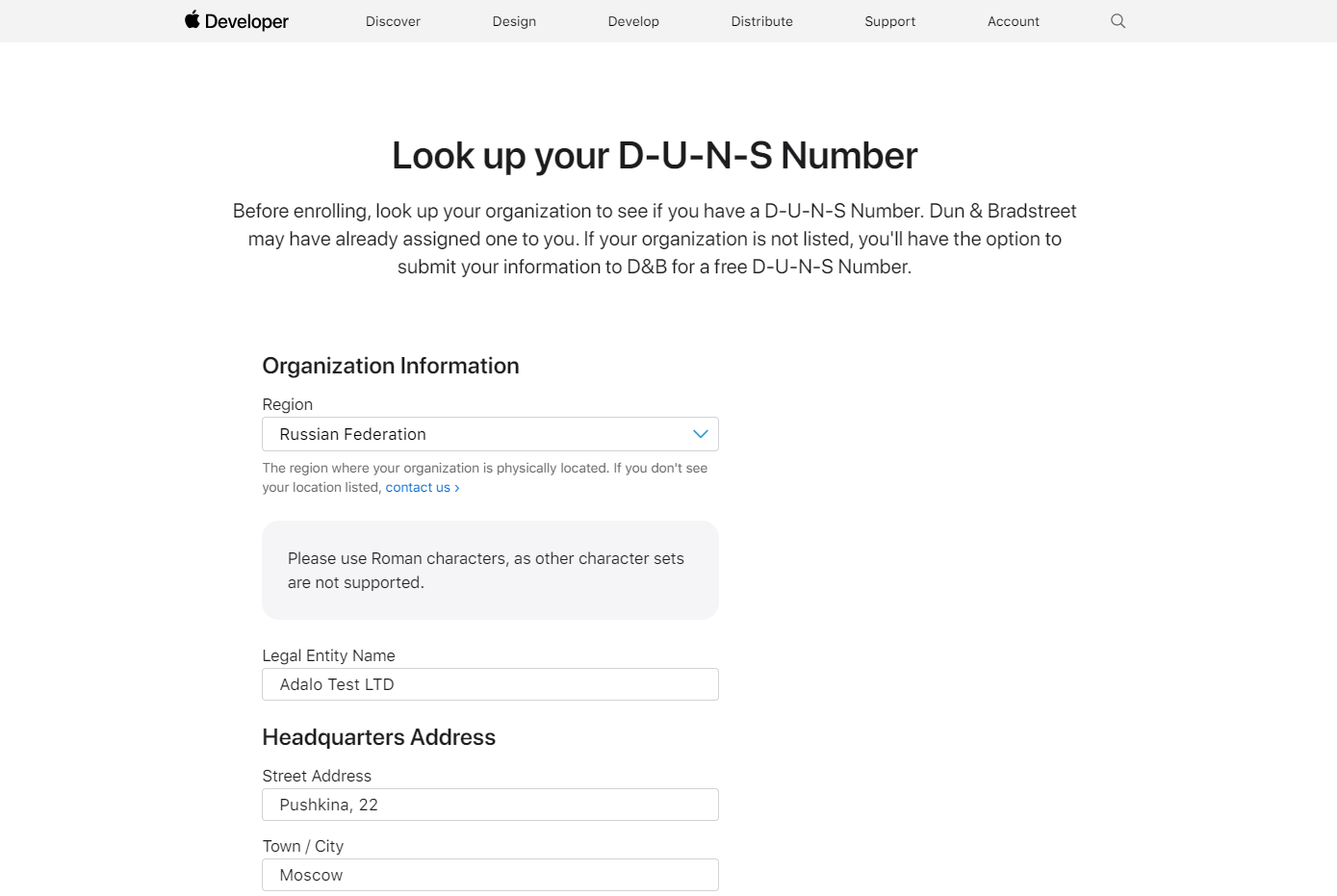 Если вы регистрируете компанию, введите ее D-U-N-S — уникальный девятизначный номер, присвоенный в американской базе данных. Чтобы его узнать, заполните форму на сайте Apple.