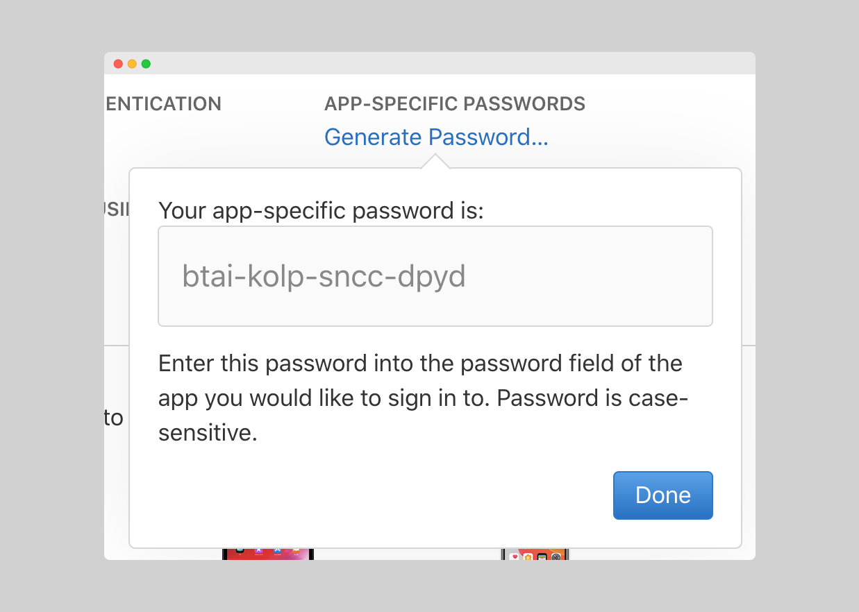 Пароль приложения отображается только один раз. Скопируйте его до того, как нажмете Done, иначе придется генерировать новый. |