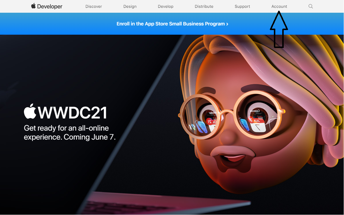 Откройте страницу Apple Developer, нажмите Account в правом верхнем углу и войдите со своим Apple ID.