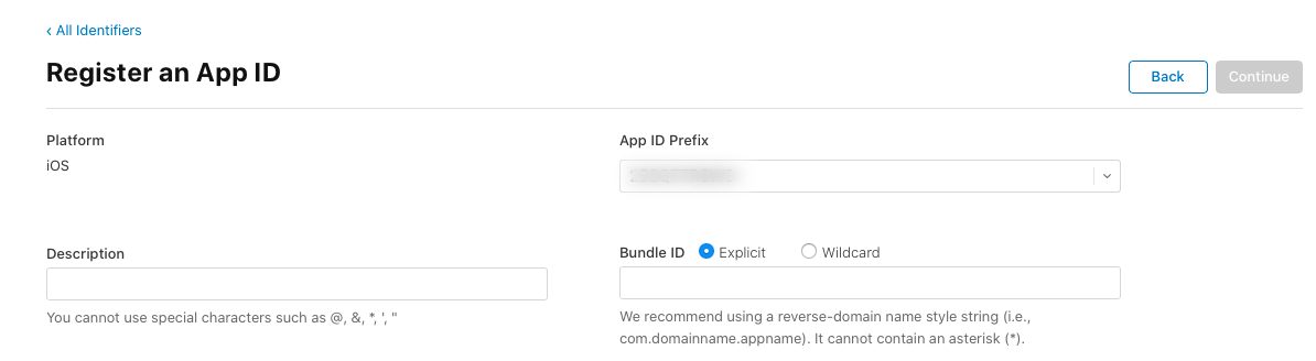В поле Bundle ID введите название приложения в формате com.«название_приложения».ios (например, com.instagram.ios). Если нужно, добавьте описание — его увидит только ваша команда.