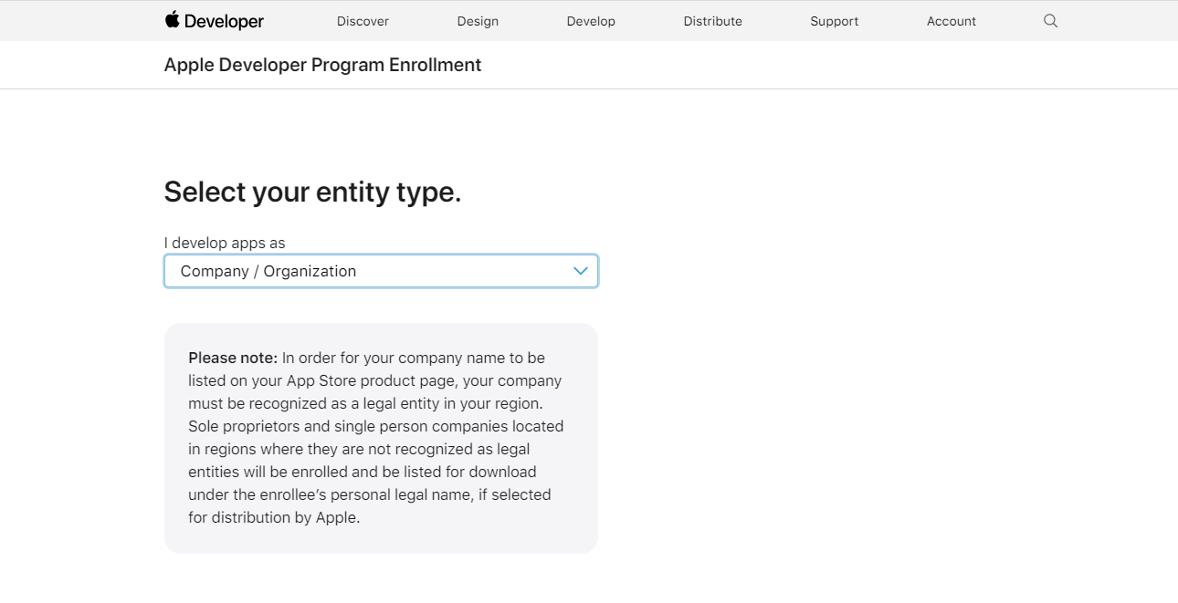 На следующей странице зарегистрируйте учетную запись Apple Developer на физическое лицо или организацию.