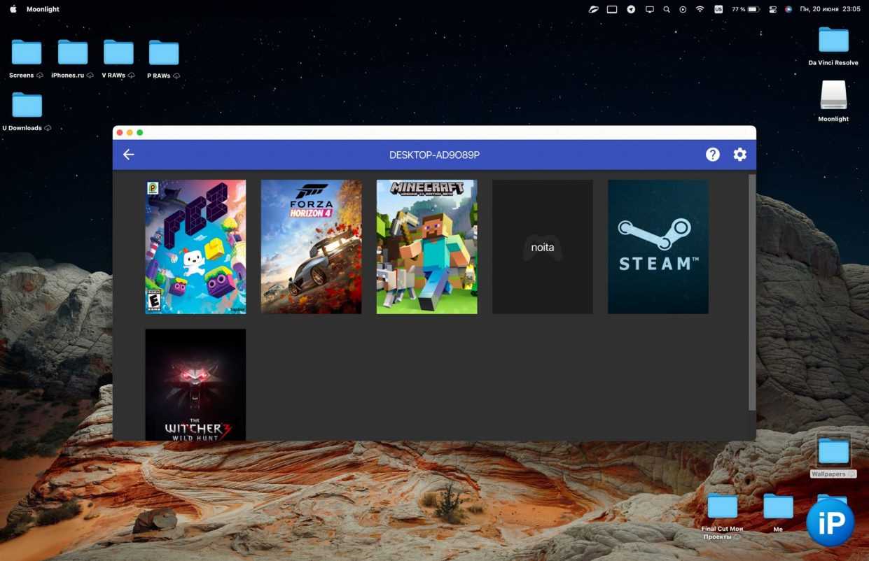 Apple то ли из вредности, то ли из соображений безопасности запрещает выводить изображение на встроенные экраны своих компьютеров по проводу. Поэтому я использую программу Moonlight для трансляции изображения с ПК. Этот проект c открытым кодом работает на базе NVIDIA Shield, покупать ничего не нужно.