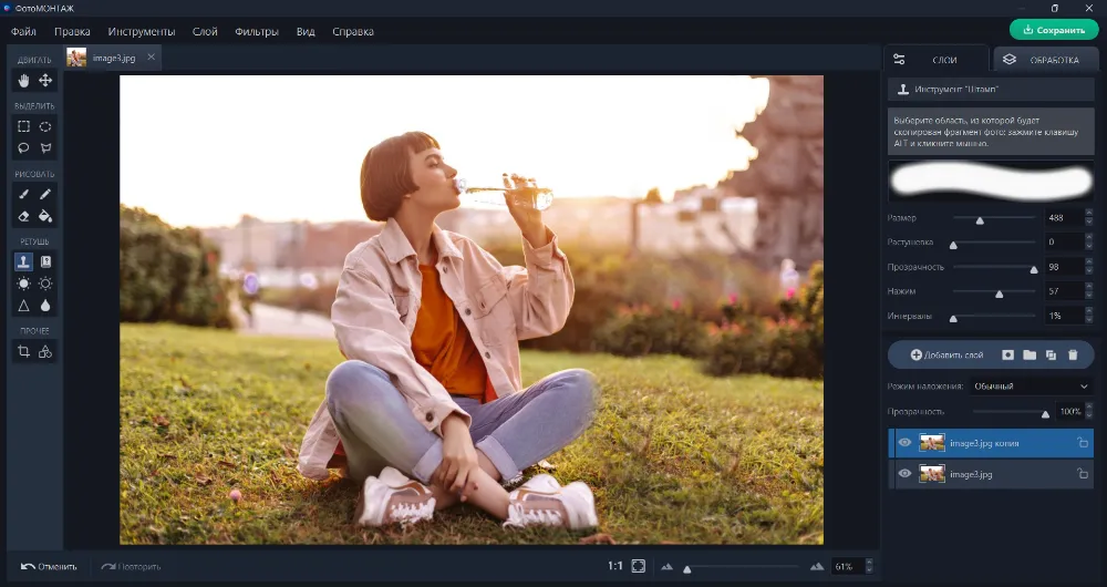 Выберите область, с которой будет скопирован фрагмент фото, и кликните по нему левой кнопкой мышки при зажатой клавише «Alt». Теперь отпустите кнопки, наведите кистью на проблемное место и вновь щелкните левой кнопкой мышки. Также кистью можно провести по области с ненужным предметом. Выполняйте работу последовательно, внимательно следя за тем, чтобы копируемые участки совпадали по текстуре с заменяемой областью. На фото ниже мы убрали рюкзак справа от девушки: