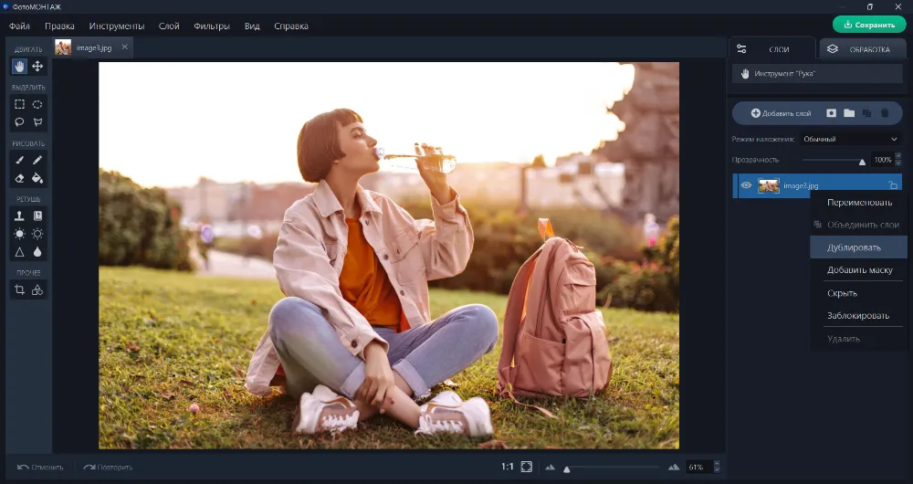 Загрузите программу ФотоМОНТАЖ и откройте в ней нужный снимок. Нажмите правой кнопкой мышки на фоновом слое и выберите пункт «Дублировать». Дубль мы создаем на всякий случай, чтобы сохранить оригинал неизменным. Хотя этот шаг не обязателен.