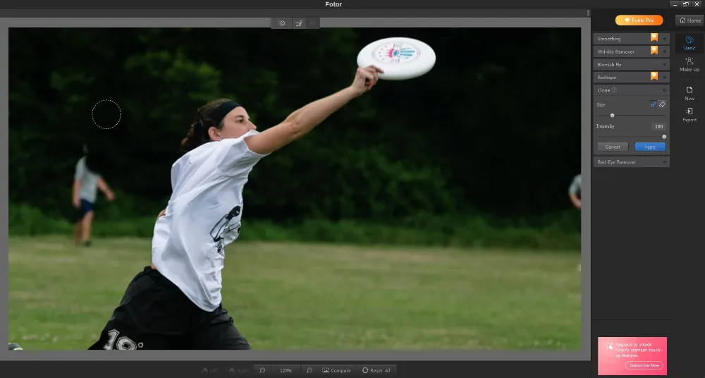 Находясь на главной странице, выберите раздел «Touch up». Затем загрузите нужную фотографию. С правой стороны экрана найдите опцию «Clone». Отметьте кружочком область, которой хотите заменить лишний объект или человека. Затем начинайте стирать. Во время процесса вы увидите, что появился второй кружочек. Именно им вы должны очищать кадр, а самый первый кружок с границами в виде пунктирной линии все время должен находиться на участке, с которого программа будет копировать текстуру.