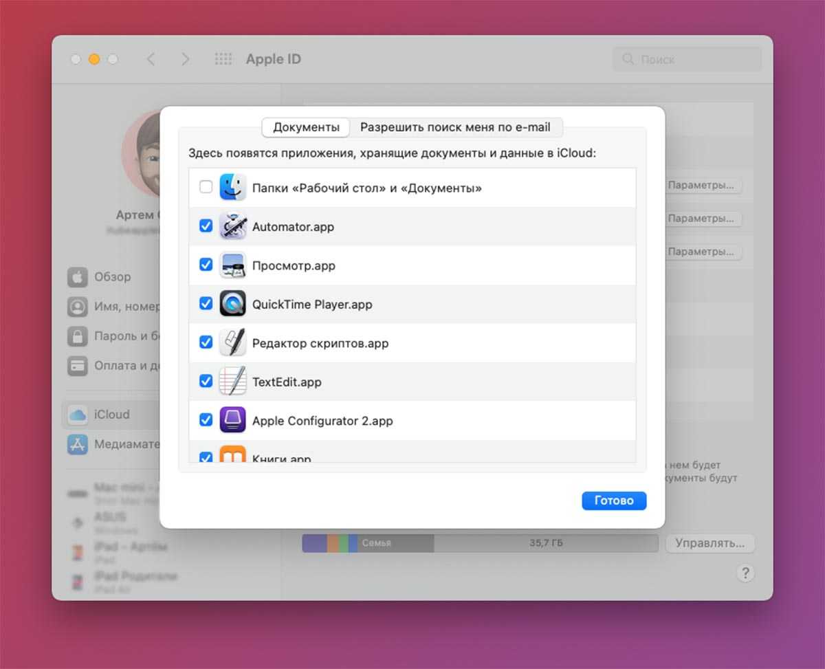 Ради очистки iCloud можно отключить эту не всегда используемую фишку. Просто перейдите в Системные настройки – Apple ID – iCloud – iCloud Drive и нажмите кнопку Параметры. В открывшемся окне следует отключить опцию Папки “Рабочий стол” и “Документы”.