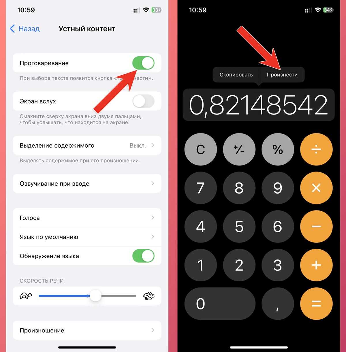 После этого в контекстном меню приложения Калькулятор (и в других приложениях на iPhone) появится опция проговаривания текста.