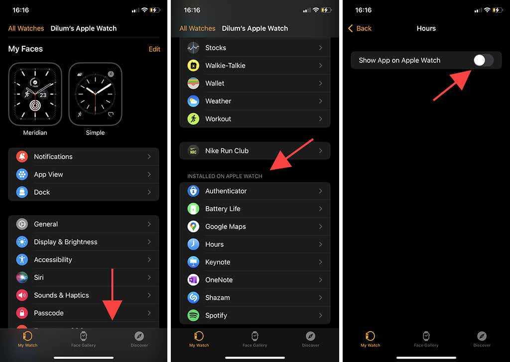 Выберите название приложения, которое хотите установить. На следующей странице выключите Показать на Apple Watch. Это немедленно приведет к удалению приложения с ваших Apple Watch